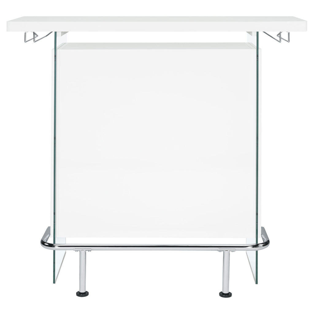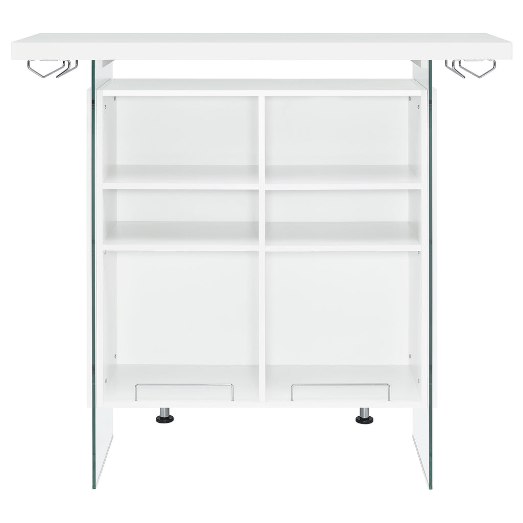 Elevate a multipurpose living room with this modern bar unit. A neutral finish, accented with polished chrome metal accents offers a striking design contrast. Supported and flanked by clear tempered glass side panels, this bar unit boasts ultra-modern elements as well for a dramatic feel. Compact yet highly functional, this bar unit also features ample storage space with six built-in open shelves for storing bottles, serving pieces and other mixologist must-haves. Tucked beneath the bar top along each side is a stemware rack for wine glasses and more. Key Features: • Modern front bar unit finished in white high gloss • Thick clear tempered glass side panels with steel footrest electroplated in chrome • Features six storage shelves and stemware racks • Constructed with MDF, particle board, glass, and metal