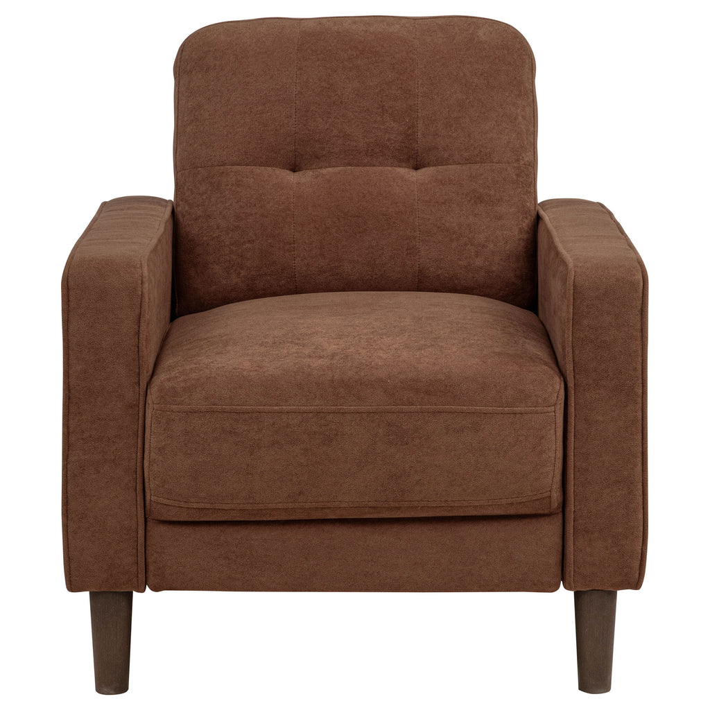 Simple yet thoughtfully detailed, this sofa set brings comfort and structure to compact spaces. Slim track arms with cord welt trim frame grid-tufted back cushions, while soft, textured upholstery creates a relaxed and inviting feel. Pocket coil seating offers lasting support, and tapered round legs provide a lifted foundation. Tailored and timeless, this collection is ideal for studio living or any room in need of space-conscious comfort. Key Features: • Sofa set with slim track arms and grid-tufted backs for clean lines and visual structure • Rust fabric adds soft texture and a versatile neutral tone to any room • Cord welt trim provides a tailored finish along arms and cushions • Pocket coil seating construction delivers consistent comfort and long-term support • Soft polyester upholstery is smooth, easy to care for, and family-friendly • Tapered round legs offer a stable, mid-century inspired lift to each piece
