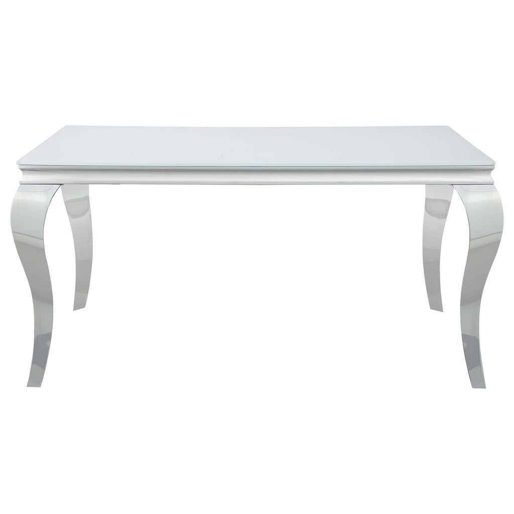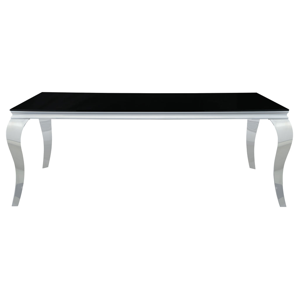 Experience the Carone five-piece dining set, seamlessly fusing modern design with timeless elements. The table's stainless steel legs bring sophistication, curving artistically and contrasting the 12mm tempered glass top with beveled edges. Hosting formal feasts is effortless on this table. Complementing this, the elegant dining chairs exude sleek sophistication. Their chrome-finished legs, including creatively curved front legs, offer a captivating shine. Luxe velvet upholstery graces the seats, available in various colors to personalize your space. Elevate your dining area with the Carone collection, where innovation meets opulence.