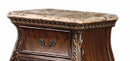 Cosmos Furniture's Cleopatra traditional style Nightstand in cherry finish wood. Create an elegant, traditional design in your bedroom with the Cleopatra Nightstand. It is a beautifully crafted from the luxurious designs of the historical past. The Cleopatra Nightstand features elaborate wood carving details on a Bombay shape and has marble top. If you are looking for timeless style and appearance this Cleopatra Nightstand will make any master bedroom feel refined and comfortable. This two (2) deep bottom drawer Nightstand has highly decorative carving on the outer borders are hand brushed in a golden contrast finish. Carefully crafted in selected wood and veneers, perfectly suited for your master bedroom. It's intricate carvings and gorgeous hand brushed Gold finish on the Nightstand accentuates the oxidized finished accented hardware on the drawers. The wood box deep drawers have dovetail construction with full extension glides. Also, the bottom drawers are dust proof. Matching other bedroom pieces are sold separately to complete the entire look of your excellent taste.
