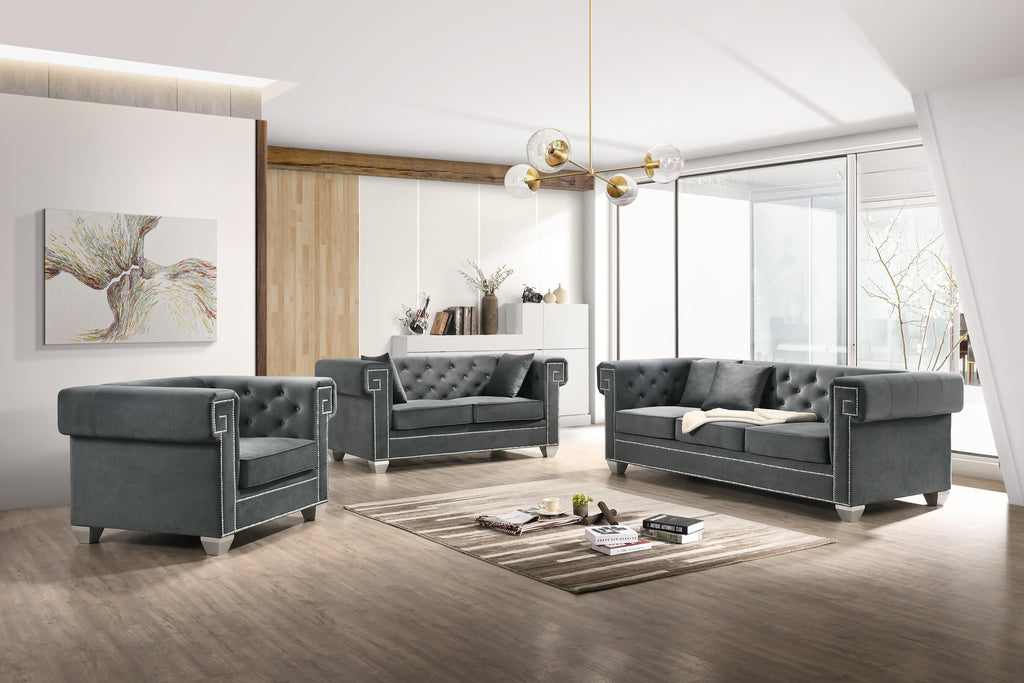 Cosmos Furniture's Clover Gray modern style Chair in lush blue velvet has steel legs with chrome nail head trim finish. The Clover Gray Chair is elegant and eye catching and is the perfect addition to any space. Modern tufted design shown by the velvet blue color cover, tufted buttons and chrome nail heads. The strength and beauty are guaranteed with sturdy wood frame and chrome legs. This chair is bound to be the conversation piece. Two (2) throw pillows are included. Matching more Clover Gray pieces are sold separately to complete the set.