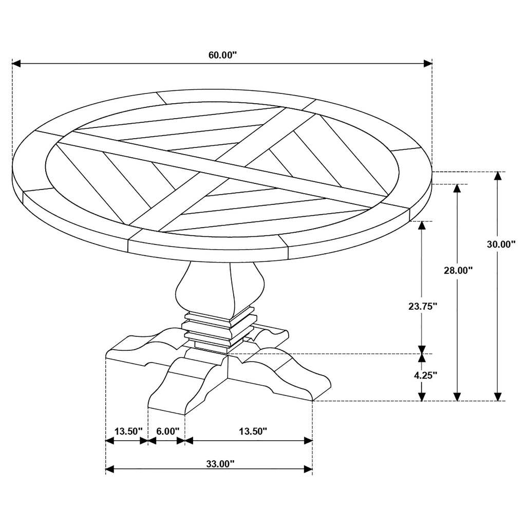 Inspired by 18th and 19th-century European design, this French country-style dining table blends timeless elegance with rustic charm. Crafted from solid pine, it features a round top with an intricate inlaid veneer pattern that enhances its refined character. The bold pedestal base, with sculpted detailing and curved feet, evokes the craftsmanship of traditional farmhouse and Colonial-era furniture. A weathered finish completes the look, making this table a warm and inviting centerpiece for any dining space. Key Features: • Round dining table with a sculpted pedestal base for timeless elegance • Crafted from 100% solid pine for lasting durability and strength • Inlaid veneer pattern enhances the round tabletop’s refined appeal • Pedestal base with curved feet evokes classic European craftsmanship • Weathered rustic honey finish brings warmth to farmhouse interiors • Perfect for casual gatherings or formal dining with vintage charm