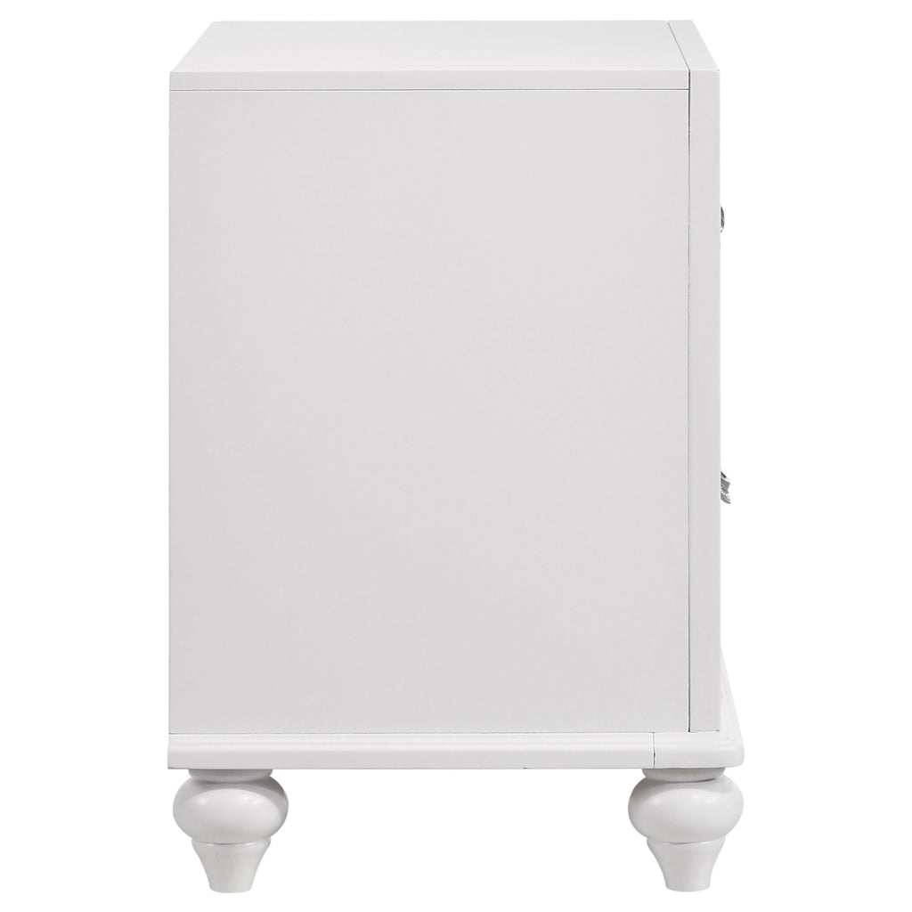 Add a touch of glamorous charm to your bedroom with this two-drawer nightstand. A clean white finish pairs beautifully with glittery acrylic drawer panels, creating a dazzling centerpiece beside the bed. Faceted crystal hardware enhances the sparkling effect, while sculpted bun feet add classic elegance. Built with solid rubberwood, engineered wood, and okume veneer, this nightstand blends durability with modern style. Two spacious drawers provide functional bedside storage with a chic flair._x000D_ Key Features: • Nightstand with white finish and glamorous details for chic bedroom appeal • Glittery acrylic drawer panels add sparkling texture and bold visual contrast • Faceted crystal hardware gleams against the smooth white frame construction • Two drawers offer ample storage to keep essentials organized bedside • Frame built with solid rubberwood, engineered wood, and okume veneer accents • Sculpted bun feet complete the design with timeless and elegant character