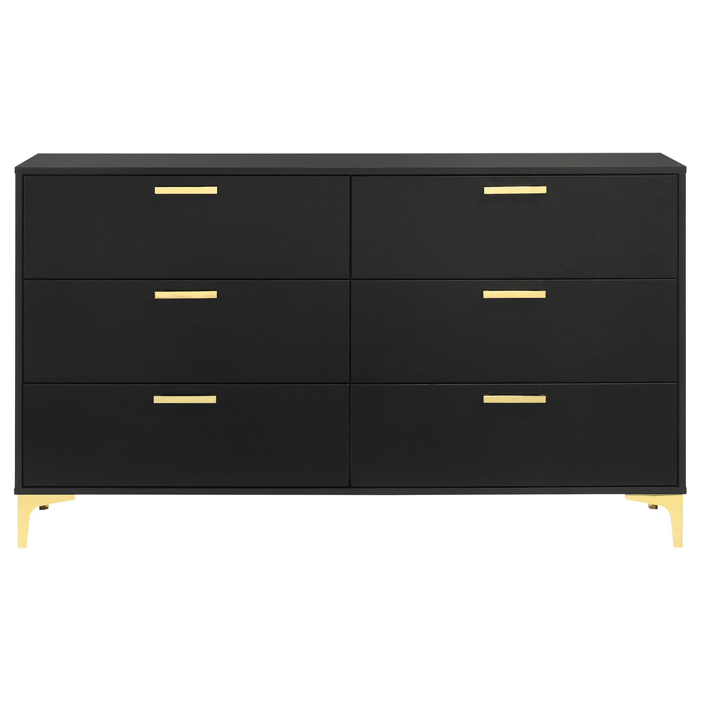 Maintain a cheerful and luxe bedroom with this splendid modern glam dresser. A perfect statement piece for contemporary bedrooms, this six-drawer dresser presents a light and airy expression. Accented with gold finished drawer pulls and bracket style legs, a luxe vibe shines through. The crisp, white finish maintains a sleek, dignified presence as well. Long and narrow, this dresser makes a lovely addition to your bedroom's focal wall and grounds a vanity dressing area. Key Features: • Perfect for contemporary and modern bedrooms • Six deep drawers offer all the space you need for garments and accessories • The bright, white finished frame ensures a light and airy disposition • Gold finished pull handles create a luxe flair • Gold bracket style legs carry through the warm metallic accents