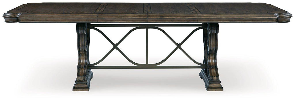 From its ornamental appliques to its large scale, this dining package makes a bold statement. With ornate details, the opulent set wows with stunning style. The look is timeless. The feel? Right at home.
