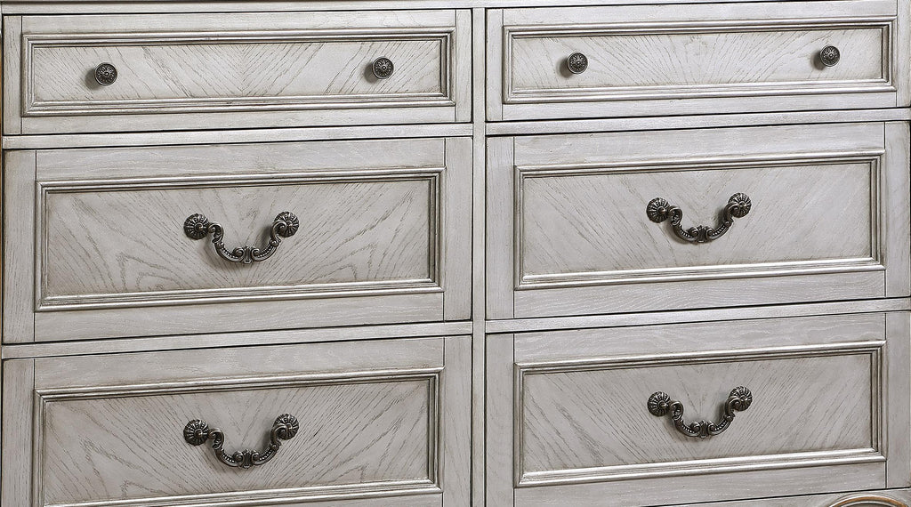 Cosmos Furniture's Melrose transitional style Dresser has brushed highlights on the wood carvings and is filled with romantic wonder. The French rococo style six (6) drawer Dresser exemplifies the design of fanciful curved asymmetrical forms and elaborate ornamentation. Melrose Dresser is plenty functional with 4 deep drawers and 2 top drawers for your jewelry or accessories. The versatile styling of this piece has brushed silver and gold finish which lets the natural oak grains shine. The legs are adorned with beautiful wood inlays displayed with gold scroll and wheat sheaf detailing. Matching Mirror and bedroom pieces are sold separately.