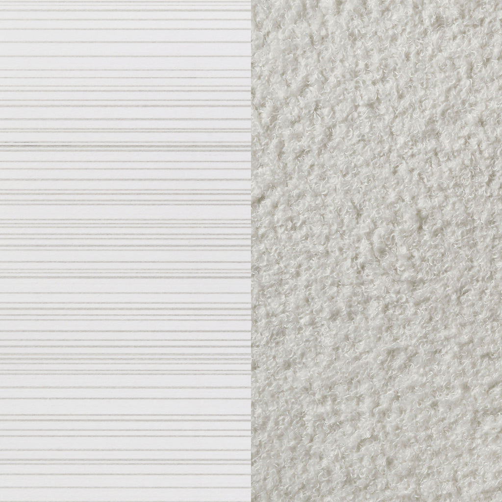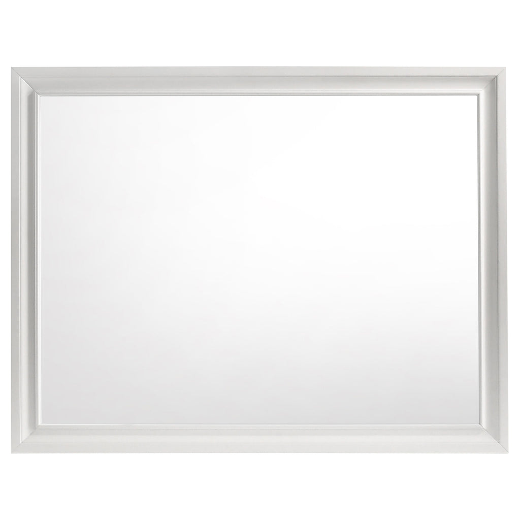 Encourage a glam vibe in your refined bedroom with a modern four-piece bedroom set. Centering on a stylish bed with an upholstered headboard and low footboard, the set includes a two-drawer nightstand for easy bedside storage and display space. A seven drawer dresser and mirror complete the set, adding diamond-like trim across its face that catches the light and offers a sophisticated touch. Bracket feet add a touch of dimensionality and movement to each piece and jewel-like bar pulls add intriguing sparkle. A cool white finish is textured, while white finish trim is smooth, creating a touch of textural contrast that add engaging style. Key Features: • Bedroom set with upholstered panel bed featuring glitter-accented headboard stripe • Textured white panel surfaces contrasted by smooth white molded trim throughout • Low profile footboard and bracket legs offer a modern and airy foundation • Storage cases include secret jewelry drawers behind glittery front panels • Drawers are felt-lined and glide on full-extension hardware for smooth operation • Crystal-style handles and sparkling trim provide glam-inspired sophistication