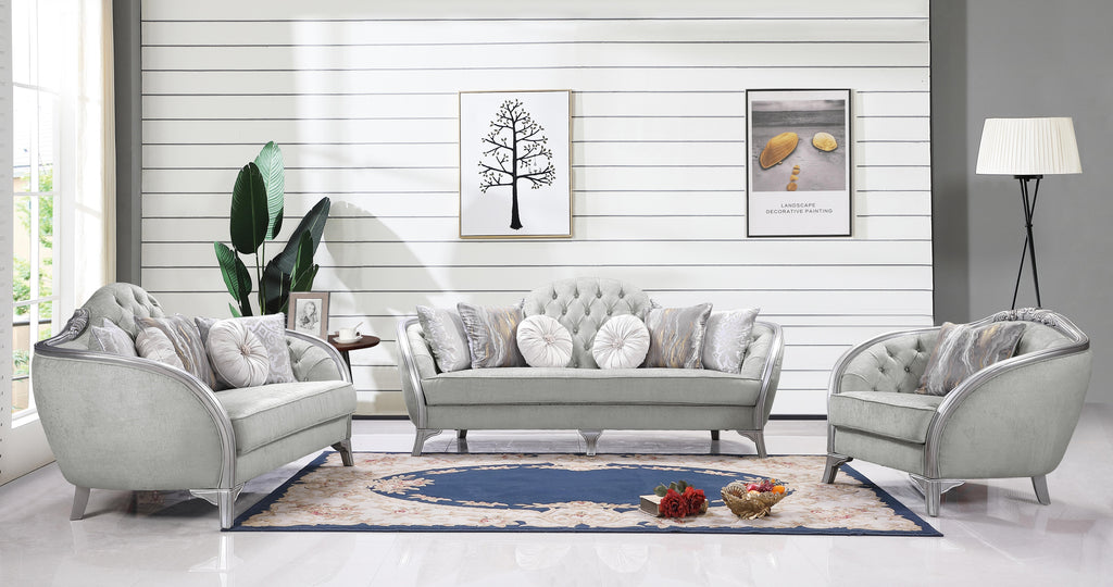 Cosmos Furniture's Natalia transitional style Loveseat is in silver gray uphostery and silver finish wood. The Natalia collection is an ideal choice for any living room. This transitional sofa set features selected linen upholstery, diamond tufted backrest, English-style arms, and is beautifully complemented by wooden legs. Pillows are included for better and comfortable back support. With its classic details this collection is sure to be a great addition to your living room. Throw pillows are included. Matching pieces are sold separately.