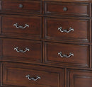 Cosmos Furniture's Rosanna traditional style Dresser in cherry finish wood has hand brushed in a golden contrast finish. This elven (11) drawer Dresser is highly decorative carving on the outer borders which are hand brushed in a golden contrast finish. It has eight (8) deep bottom drawers and three (3) top drawers are for your jewelry or accessories. Carefully crafted in selected wood and veneers, perfectly suited for your master bedroom. It has intricate detailed carvings, looping and a gorgeous hand brushed Gold finish on the Dresser accentuates the crystal finished accented hardware on the drawers. The wood box deep drawers have dovetail construction with full extension glides. Also, the bottom drawers are dust proof. Matching Mirror and other bedroom pieces are sold separately to complete the entire look of your excellent taste.