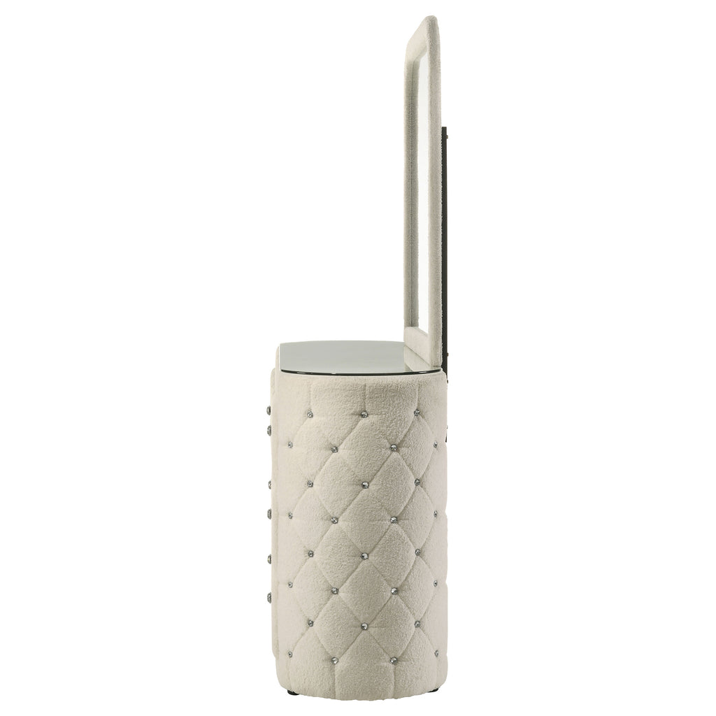 Wrapped in a cloud of boucle and gleaming detail, this dresser and mirror set transforms any bedroom into a personal sanctuary. Diamond tufting along the sides sparkles with embedded crystal accents, while vertical channeling on each drawer adds tailored rhythm and depth. Topped with a sleek mirror framed in matching fabric, the design offers a romantic balance of softness and structure, inviting both elegance and indulgence into everyday routines. Key Features: • Dresser and mirror set features plush boucle upholstery in a soft ivory tone throughout • Six drawers with vertical channeling offer bedroom storage and refined visual texture • Diamond-tufted sides embellished with crystal-style accents elevate the glam appeal • Clear tempered glass top offers a smooth, durable surface that enhances the look • Framed mirror matches the upholstered silhouette for a cohesive bedroom presentation • Crafted from solid rubberwood, engineered wood, boucle fabric, and foam for longevity